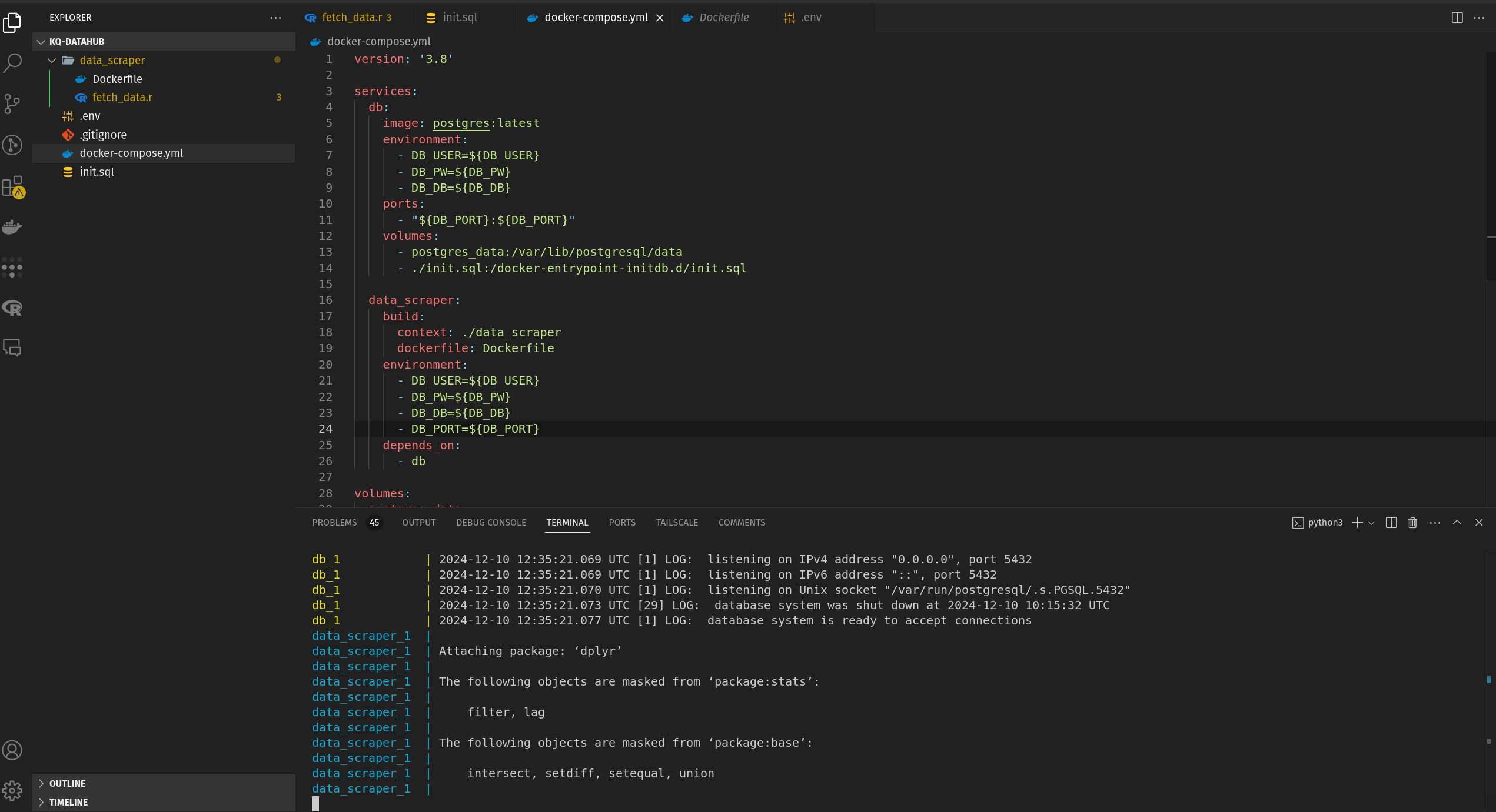 The following configuration defines two services: the database (db) and our data-scraper, each with their own isolated dependencies and underlying software stack. It uses the above Dockerfile to build the data scraper we just configured, which is an R application that makes outgoing HTTP requests to the free coinmarketcap.com API while db is just a PostgreSQL database. The .yml file also defines and mounts a volume - think of it as its own filedrive for now - for the data we want to store in that database. Since we need to connect and authenticate against the database, we're defining environment variables and after reading them from an .env file push them through to the containers at build time.