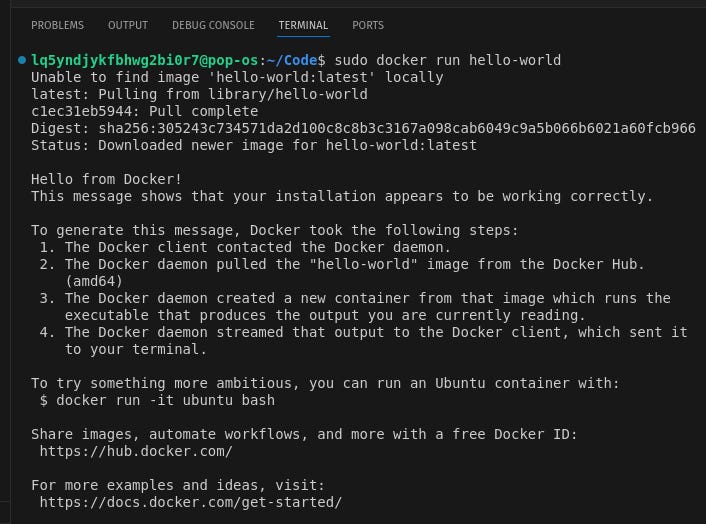 sudo docker run hello-worldwhich pulls in a hello-world application and then runs it inside your terminal.