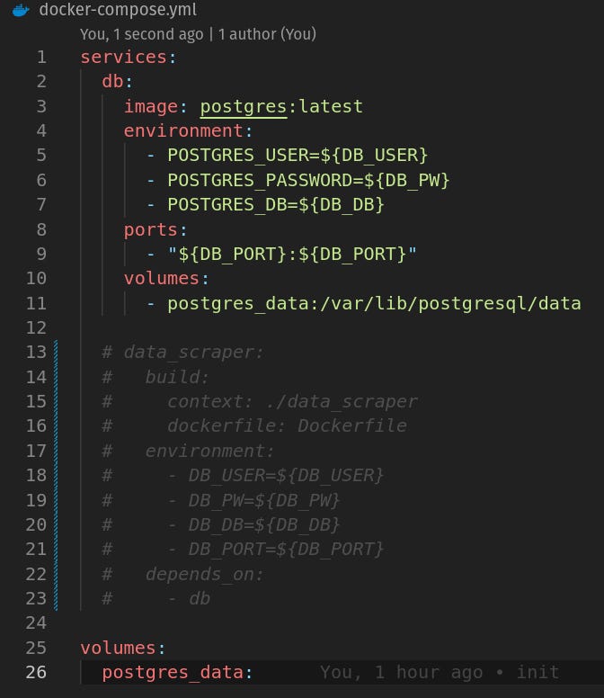 Although there are many more useful commands and flags/switches for the docker CLI, we're not going to talk about them today. The above Dockerfile really only defines one service: the data scraper, which handles fetching historical data for crypto tokens. We don't persist this data anywhere yet. For this we're going to set up a PostgreSQL database.