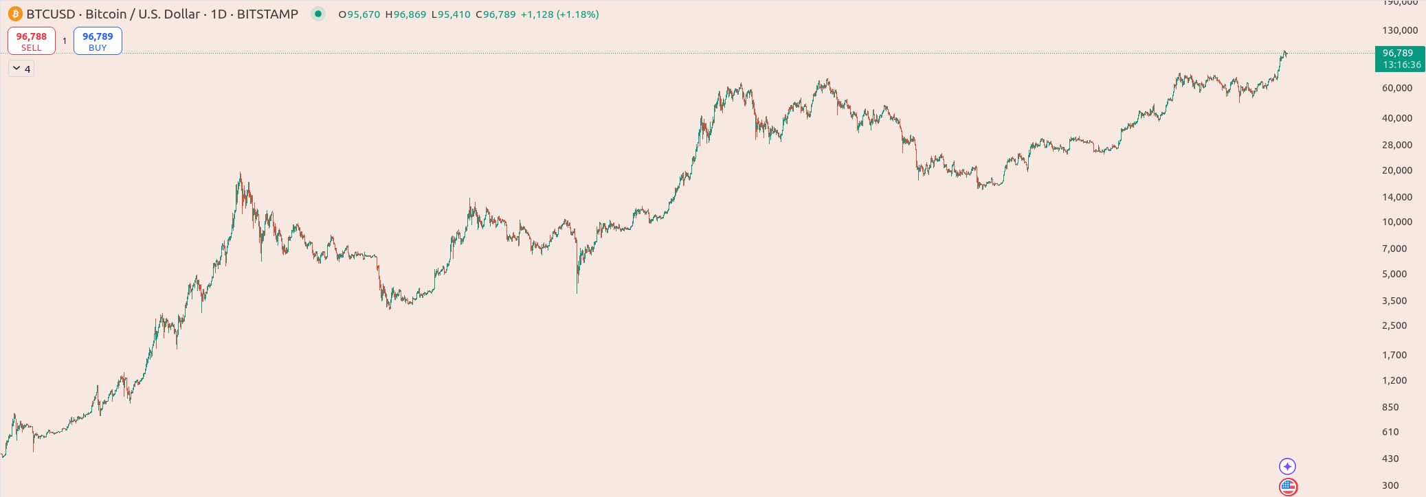 plot_equity_curve(daily_returns, ticker)You might recognize the shape of this curve. It's basically the BTC/USD price curve over time. Which makes total sense because we're just buying and holding 1 spot unit of BTC.