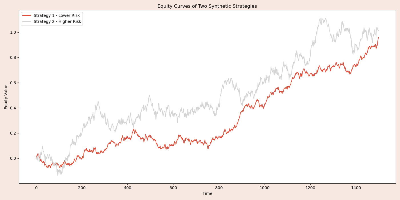 Again, looking at the equity curves alone, we'd clearly be better of putting our money into strategy 2. At any given point in time its returns are outperforming strategy 1. After all, we've hardcoded strategy 2 to return 5% more.