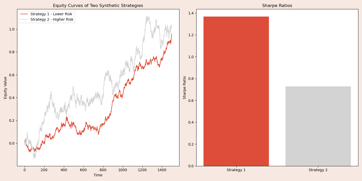 That's right, the formula is adjusting a strategies returns based on its risk using the std_dev like we just manually did . Let's calculate the Sharpe Ratio for both our strategies using our metrics.py file and plot it alongside the equity curves: