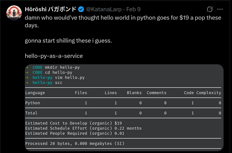 The tools used to measure LLM output reinforce the illusion. scc‘s COCOMO model estimates the rewrite at $21.4 million in development cost. The same model values print("hello world") at $19.